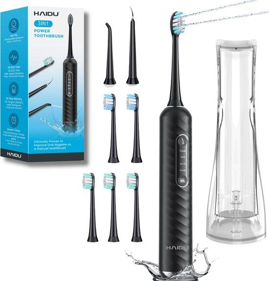 - HAIDU 3 in 1 Elektrische Tandenborstel + 5 Opzetborstels + Waterreservoir – Zwart