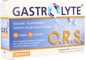 Gastrolyte Orange Sachets ter behandeling en voorkoming van uitdroging bij diarree bij volwassenen, kinderen en zuigelingen. Garstrolyte Orange kan het vocht- en zoutverlies bij diarree voorkomen en snel corrigeren. Gastrolyte Orange is een gemakkelijke instantbereiding met een aangename sinaasappelsmaak. Werk binnen 30 minuten product is geschikt voor zowel volwassenen, kinderen als zuigelingen. ü Glucose zorgt voor een betere wateropname. Voorkomt uitdroging Vorm en verpakking : Doosje à 10 zakjes met 8 gr poeder. Ingrediënten : glucose, natriumchloride, trinatriumcitraat, kaliumchloride, sinaasappelaroma.