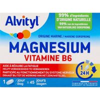 (45 Urgo; Alvityl®) Alvityl® Magnesium Vitamine B6 levert in slechts 1 tablet per dag de hoeveelheid magnesium en vitamine B6 die bijdragen tot de vermindering van vermoeidheid en het behouden van een normale psychologische functie. Magnesium draagt bij aan een normale spierfunctie.Inhoud: 45 tablettenVerdeler: Urgo15 avenue d’Iéna75116 ParijsFrankrijk