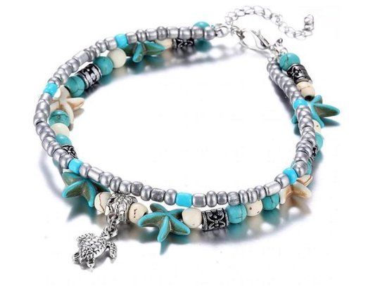 Enkelbandjes lichtblauw schildpad - 2 stijlvolle enkelbandjes - Zilverkleurig met Licht blauw - Schildpad - Enkelbandjes