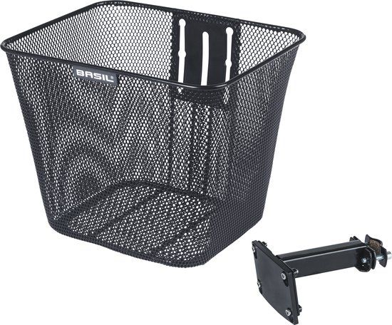 BASIL mand, voorop "Bilbao" Maten (L x B x H): 26 x 22 x 27 cm, fijnmazig, vaste montage op stuurpen met permanente houder, staal Houder voor buis-Ø 22-26 mm (0.838.051/1), in hoogte verstelbaar i.› zwart