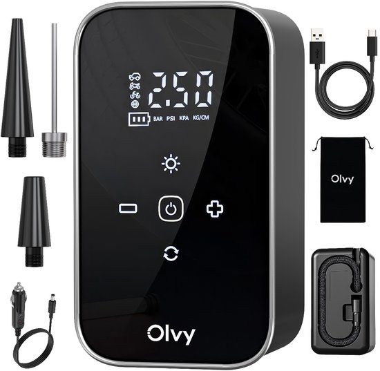 - Automatische uitschakeling: De Olvy Bandenpomp schakelt automatisch uit wanneer de gewenste druk is bereikt, om overinflatie te voorkomen. Geen zorgen meer over te hard of te zacht opgepompte banden.