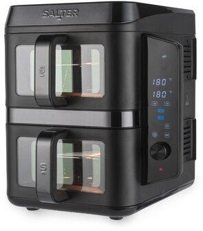 Verhoog je kookvaardigheden met de Salter VertiCook View Air Fryer! Geniet van een royale capaciteit van 9L, verdeeld over twee vaatwasmachinebestendige en PFAS-vrije manden van 4,5L dankzij het verticale ontwerp, waardoor je kunt koken op vier niveaus. Een grill van roestvrij staal is inbegrepen en je kunt kiezen uit 12 vooraf ingestelde kookfuncties, waaronder Sync & Match.