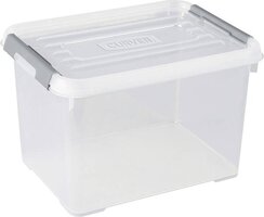 Transparante universele box met deksel en clip-sluitingen aan de zijkant, nestbaar. De teksten voor dit artikel zijn automatisch vertaald.