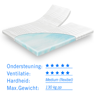 Extra comfort extra ondersteuning in uw bed Door dit split-topdekmatras of te wel matrastopper over je huidige matras te leggen, kun je extra slaap comfort in je bed creëren. Met zijn totaal dikte van 9 cm is dit een kwaliteit koudschuim split-topper en zorgt voor extra comfort en extra ondersteuning in uw bed. Altijd fris door uitstekende ventilatie Open celstructuur eigenschap van koudschuim en openstructuur van stof zorgt voor een perfecte luchtcirculatie. Dit zorgt er dan weer voor dat het topdekmatras ventileert en je bed altijd fris blijft. Wat zijn de voordelen van een koudschuim Topdekmatras Een koudschuim todekmatras heeft o.a. de volgende goede eigenschappen: * Zeer veerkrachtig en zorgt voor betere ondersteuning voor uw lichaam * Zeer goed ventilerend door zijn open celstructuur en vocht afdrijvend * Lange levensduur * Anti kuilvorming * Anti allergisch Voor wie is een koudschuim Topdekmatras geschikt? * Voor iedereen die een extra comfortabel bed wil hebben en de levensduur van zijn huidige matras wilt verlengen. * Voor mensen die een goede veerkracht en een ondersteunende laag in het matras willen hebben. * Voor mensen die het snel warm hebben in bed en veel transpireren. * Voor iedereen die een twee eenpersoons matras hebben van de zelfde dikte en geen spleet tussen de matrassen willen hebben. Hoe dik moet een koudschuim Topdekmatras zijn ? Dat is afhankelijk van uw persoonlijke voorkeur en van uw budget. Als uw huidige matras te hard is en het biedt geen voldoende comfort, kunt u gerust een dikke koudschuim matrastopper er boven op leggen, dan heeft u een prima bed met veel comfort. Prima oplossing voor spleet tussen twee matrassen. Ook in het geval dat je partner een andere soort matras neemt van de zelfde dikte. Want een matrastopper leggen over twee matrassen is een prima oplossing voor de spleetvorming tussen de matrassen. Het voelt dankzij de topper met twee losse matrassen toch aan als een comfortabel matras. Volledig duurzaam gefabriceerd. Materialen van onze matrassen en topdekmatrassen zijn voor gezondheid ( oeko-tex®) gecertificeerd en 100 % duurzaam recyclebaar materialen gemaakt. Denk bijvoorbeeld aan stalen pocketveren die worden gesmolten en weer tot staal verwerkt. Stoffen hoezen worden verwerkt tot nieuwe grondstoffen in de textiel industrie. Van het oude schuim van het matras worden weer grondstoffen gemaakt zoals onderlagen van vloerbedekkingen of isolatie materiaal voor verschillende doeleinden. U slaapt dus op een product die samengesteld is van gecertificeerd materialen voor gezondheid en minimale belasting op het milieu heeft. Dat voelt dan weer goed zo dat u met een gerust hart lekker kunt slapen.