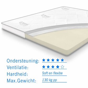 Traagschuim Topper Tencel Deluxe gewichtloos gevoel Een zachte luxe topper dat naar het lichaam vormt Door deze topkwaliteit traagschuim/Nasa topdekmatras-topper over je huidige matras te leggen, kun je extra slaapcomfort en plezier in je bed creëren. Het visco-elastisch materiaal traagschuim is een zacht en soepel schuim soort. Onder invloed van warmte en het lichaamsgewicht wordt traagschuim zacht en vormt zich naar de lichaamsvorm. De luxe uiterlijk komt mede doordat de topper extra dik is, veel dikker dan de meeste andere toppers. Deze topkwaliteit traagschuim Tencel topper zorgt voor extra comfort en extra ondersteuning in het bed en geeft hierdoor jarenlang slaapplezier. Maximaal vochtuitdrijvende en uitstekende ventilatie door Tencel stof Een Tencel tijk is de nummer één als het gaat om vochtuitdrijving, boven alle andere materialen die wordt gebruikt in jouw matrastopper. Dit zorgt er voor dat topdekmatras perfect ventileert en je bed altijd lekker fris blijft. Tencel vezels zijn gemaakt van natuurlijk hout cellulose en heeft belangrijke eigenschappen dat aanvoelt zoals: de zachtheid van zijde, koel en vocht absorberend en afdrijvend van nature anti bacterieel en anti allergisch. Alle voordelen op een rij: * Circa 11 cm dik soepel traagschuim/NASA topper van hoge kwaliteit * Rechtstreeks uit de fabriek * Nederlands fabricaat * Soepel en viscose elastische schuim dat vormt naar het lichaam * Optimale comfort en gewichtloos gevoel * 3 jaar volledige garantie Voor wie is een traagschuim/NASA topper eigenlijk geschikt? * Voor mensen die last hebben van knellende spieren en zenuwen tijdens het slapen. * Voor mensen die hun gewrichten willen ontlasten. * Voor mensen die het snel koud hebben in de bed. * Voor mensen die van een heerlijk zacht bed houden. * Voor mensen die hun huidige matras te hard vinden en wat zachter willen liggen Let wel op, traagschuim vormt naar je lichaam, maar geeft niet zoveel ondersteuning als een koudschuim topper omdat het zacht is. Daarom is het belangrijk dat het huidige matras waar je een traagschuim/ NASA topper op legt voldoende ondersteuning geeft. Deze mag niet doorgezakt zijn. De ondergrond moet voldoende ondersteuning geven. Heeft het matras eronder bijvoorbeeld een kuil, dan heeft een topper er bovenop leggen geen zin. Daarom adviseren wij een stevige pocketveermatras met een Koudschuim toplaag of een blok koudschuim matras die voldoende lucht doorlaat. Dit zou de perfecte combinatie zijn met een NASA traagschuim topdekmatras. Prima oplossing voor spleet tussen twee matrassen. Heb je twee 1-persoonsmatrassen of heb je twee verschillende matrassen, maar wel van dezelfde dikte, dan is een matrastopper een prima oplossing voor de spleetvorming tussen de twee matrassen. Het voelt dankzij de topper met twee losse matrassen toch aan als een hele tweepersoonsmatras met extra comfort. Tevens creëer je een echt luxe hotel gevoel met deze royale en heerlijk zachte NASA traagschuim topdekmatras. Vergelijkbare toppers zijn in de winkels veel duurder geprijsd om hoge overhead kosten te dekken! Als droommatras leveren wij dit topdekmatras rechtstreeks uit de fabriek naar jouw adres. Hierdoor besparen wij aan allerlei kosten van tussenhandels en alle denkbare kosten van een fysieke winkel. Doordat wij de kosten zo laag mogelijk houden profiteer jij van zeer lage internetprijzen tegen de beste condities. Niet voor niets worden wij door onze klanten beoordeeld met 9.5/10 bij Kiyoh (de grootste en meest betrouwbare onafhankelijke beoordelingssite van NL) en raden 97% van de klanten ons aan bij hun familie en vrienden. Enkele voordelen op een rij: * 100 dagen proefslapen * Gratis bezorging * Nederlandse fabricaat * Rechtstreeks uit fabriek naar jouw adres * Hoogste klanten beoordeling (9.5/10 Kiyoh) * Veilig achteraf betalen * Betalen in 3 termijnen Specificaties Hoogte circa 11 centimeter Kern Traagschuim/NASA Hoes/Tijk samenstelling Tencel stof Hoes/Tijk doorstikking 300 gram Anti-allergische watten Hoes/Tijk afritsbaar Ja Anti-allergisch Ja Anti-huisstofmijt Ja Ventilatie Uitstekend Maximale belasting 130 kilogram per persoon Weerszijden beslaapbaar Ja Geschikt voor verstelbare bodems Ja Vrij van schadelijke CFK gassen Ja