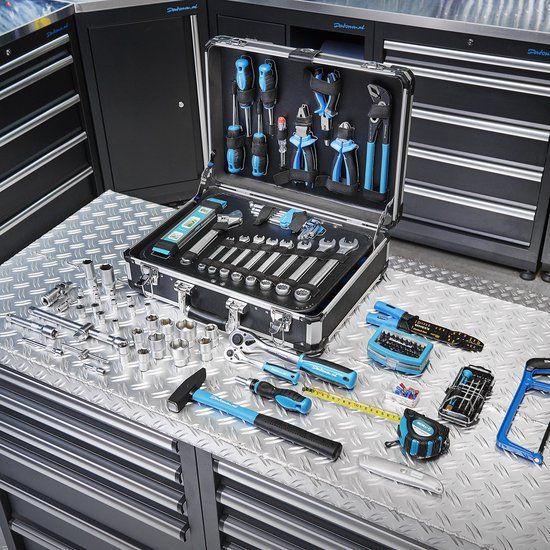 Deze koffer, bestaande uit twee verdiepingen, bevat alle basisbenodigdheden voor de doe-het-zelver, zoals schroevendraaiers, tangen en inbussleutels. Ook beschikt hij over een paar bijzondere toevoegingen zoals een handzame waterpas, een ijzerzaagje en een krimptang/kabelstripper. Verder zitten er nog een steek-ringsleutelset, een mes en een hamer in: ideaal voor de dagelijkse klussen in en rondom het huis. Maar ook in de caravan of op de boot is deze set ideaal. Even snel een bout vastzetten of onderdeel vervangen; met deze gereedschapkoffer kan dat allemaal. De ratel bithouder met bitsets maakt de set helemaal compleet. De bandjes in de koffer zijn elastisch en van klittenband. Deze koffer is hét perfecte vader-en moederdag cadeau!