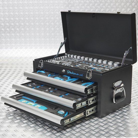 Deze gereedschapskist is ideaal voor mensen die graag hun gereedschap meenemen naar bijvoorbeeld het circuit. Hij beschikt namelijk over twee handvaten aan de zijkanten en is compact van formaat. Er zijn in totaal 5 plekken waar je gereedschap kunt opbergen; 3 lades en onder de klep is nog een extra plek. Die klep is af te sluiten door middel van een slot met sleutel.
