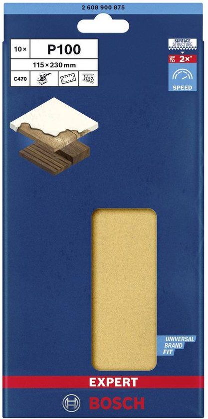 Tot 2 keer sneller dan standaard schuurpapier - het schuren van grote oppervlakken is tijdrovend: Veel schuurpapier gaat snel met stof zitten en verliest zijn abrasieve werking, waardoor het eigenlijke schuurproces meer tijd nodig heeft. Door de combinatie van scherpe korrels en speciale technologie, die het verstoppen voorkomt, behoudt het Expert C470 schuurpapier zijn bijzondere vaardigheden. Dit betekent dat u sneller en langer kunt werken zonder concessies te hoeven doen aan het slijperresultaat. Om de best mogelijke schuurvlakken te bereiken, worden bij onze productiemethode voor een agressieve korreluitlijning de korrels zo uitgelijnd dat de scherpste kant boven ligt. Dan bedekken wij ze met een sterke binding en een coating om constipatie te voorkomen. Dit zorgt samen met een optimale korreldichtheid voor maximale snelheid en minimale verstopping. Breng minder tijd aan met het schuren of meer werken in dezelfde tijd - met het Bosch Expert C470 schuurpapier. Eenvoudige bevestiging met klittenbandsluiting.