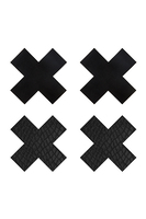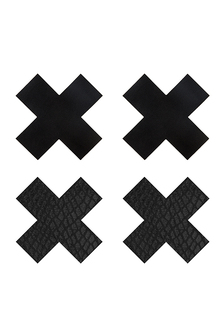 Een set van 2 paar zelfklevende tepelstickers in de vorm van zwarte kruisjes. Het ene paar heeft een glad oppervlak, het andere paar heeft een slangenhuid textuur. De stickers zijn zacht en soepel zodat ze de contouren van je borsten mooi volgen. Je brengt ze eenvoudig aan door het beschermlaagje van de achterkant te verwijderen en ze met de plakzijde op je tepels te plakken. Kleurzwart