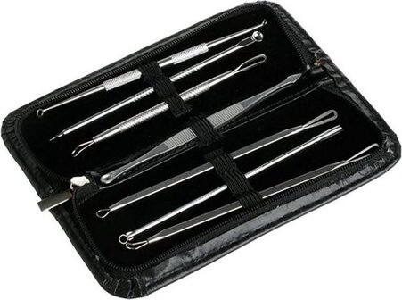 Vrijwel iedereen heeft wel eens last van een verstopte porie. We hebben ze liever niet en met behulp van deze 7-delige comedonen lepel set kunt u ze het beste verwijderen! Met deze set houdt u uw huid eenvoudig en zonder risico van verdere onsteking (wat je wel hebt als je met je nagels een puistje of mee-eeter weghaalt) schoon en gezond! Neem de compacte set mee in uw handtas en je kunt altijd en overal stralen.