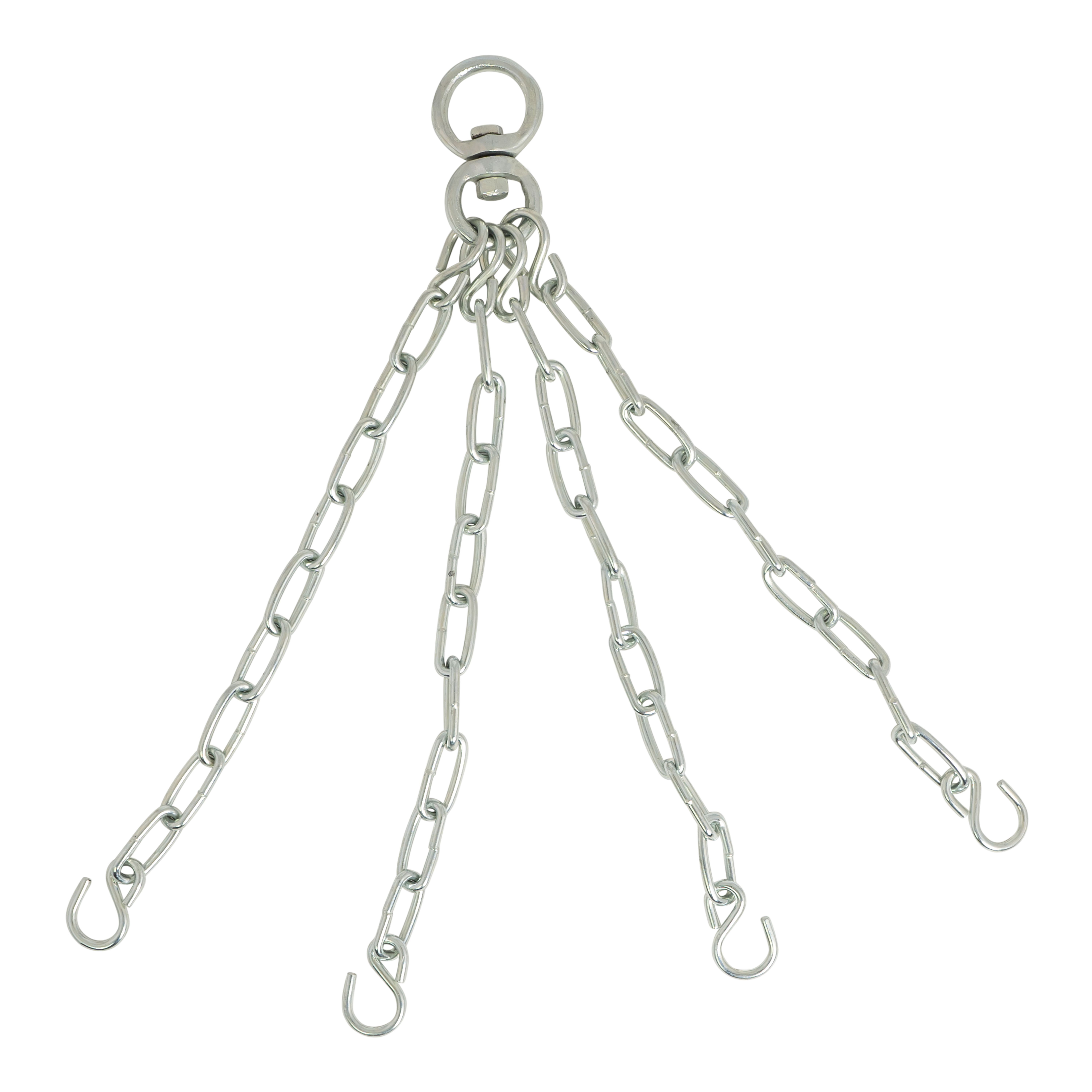 Veilig boksenEen bokszak ophangen? Dat doe je met deze bokszak kettingset! Na elke trap of stoot zorgt de vierpuntsketting er voor dat de bokszak snel en stabiel terug zwaait naar zijn beginpositie. De kettingen zorgen er voor dat de kracht van de impact goed verdeeld worden zodat de bokszak niet te hard heen en weer zwaait. Dat maakt het trainen veiliger voor jezelf en je omgeving.Voordelen✔ Verdeelt het gewicht van de zak en impact van stoten gelijkmatig✔ Zorgt dat de bokszak altijd recht hangt✔ Geschikt voor alle bokszakken met vier ogen✔ Met meegeleverde wartel✔ Voor een veilige trainingVoordelen van vier puntenEen vierpuntsketting verdeeld de belasting van het gewicht van de zak. Ook zorgt het voor een goede verdeling van de impact van de trappen en stoten over de kettingen en de ophangogen. Een vierpuntsketting is daarmee veiliger dan een eenpuntsketting, waar één ketting en oog alles moet dragen. Daarnaast zorgen de kettingen er voor dat de bokszak altijd recht hangt.De bijgeleverde wartel verbindt de kettingen met een vrijdraaiende as. Dat zie je goed als je zijdelingse slagen uitdeelt en de bokszak goed meebeweegt. De schakels zijn uiterst stevig en geschikt voor bokszakken tot vijftig kilo.Specificaties• Afmetingen: L 20 x B 12 x H 2 cm• Gewicht: 700 gr• Kleur: grijs• Materiaal: metaal• Maximale draagkracht: 50 kg