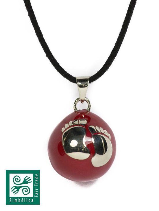 Rode zwangerschapsbal, verzilverd en met rode resin en voetjes. De hanger heeft een diameter van 20 mm en hangt aan een lang zwart (imitatie-)suede koord, verstelbaar met behulp van de schuifknoopjes. Het is lang genoeg om gedurende de hele zwangerschap mee te bewegen. Het sieraad wordt gestuurd in een grote luxe sieradendoos. De bal geeft een rustgevend geluidje voor je baby.