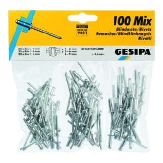 Kenmerken: GESIPA® standaard blindklinknagels zijn verkrijgbaar in een grote verscheidenheid van ontwerpen, materialen, vormen, lengtes en ook kleuren. Het blindklinknagelassortiment met 100 blindklinknagels van aluminium/staal in de afmetingen 4 mm Ø x 6, x 8, x 12 mm is bijzonder praktisch voor doe-het-zelf-gebruik.