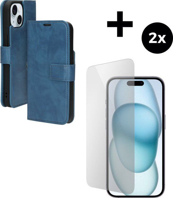 Mobiparts Classic Wallet Case for Apple iPhone 15 - Blue with 2x Tempered Glass Screen Protectors - Hoezen voor mobiele telefoons