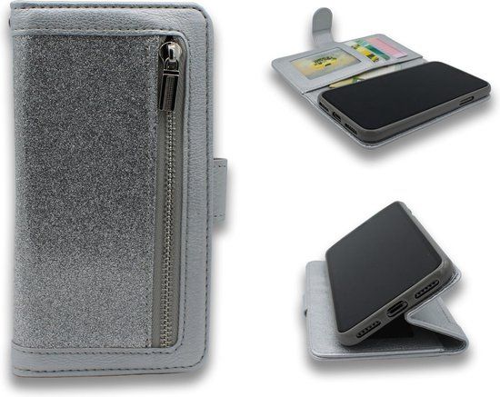 - HB Hoesje Geschikt voor Samsung Galaxy A10 - Luxe Glitter Portemonnee Book Case met Rits - Zilver