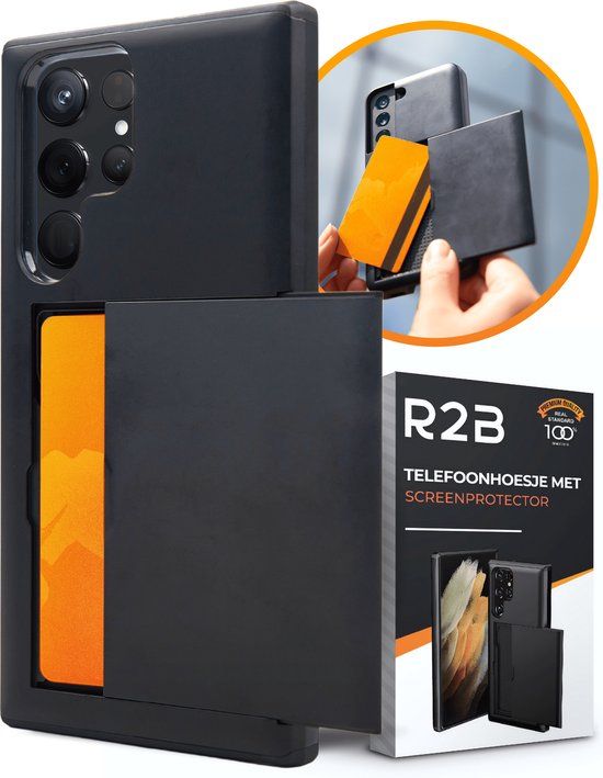 R2B - Samsung Galaxy S22 Ultra Hoesje met pasjeshouder - Zwart - Model Utrecht - Incl. Screenprotector - Hoezen voor mobiele telefoons