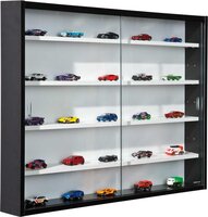 Zwart/wit vitrinekastje Collecty met 2 glazen schuifdeuren en 4 legplankjes.