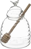 Glazen honingpot met honinglepel/stokje. De pot beschikt over een geribbeld relief en heeft een bijtje op de deksel. Vaatwasserbestendig. Afmeting: ca. 9,5 x 13 cm. Inhoud: ca. 400ml.