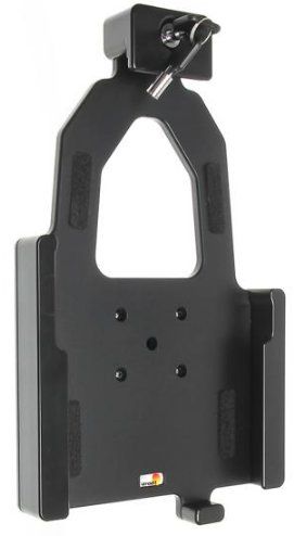 Holder with lock.\n\nPassive holder with tilt swivel. For devices with original skin. With lock, 2 keys included. The holder with lock is to be used when you want to have your tablet safely locked in place and still easy accessible, for example in shops, exhibitions, events, trucks, boats etc. The holder has a built-in lock, in order to take the device out from the holder you need a key (2 keys included). You can connect e.g. a charging cable to the device when it is in the holder. The holder is mounted onto a tilt swivel. This mean you can easily adjust the angle for better viewing and switch between portrait and landscape mode simply by turning the holder into desired position. Tablets (Surfpads) should not be installed onto a car’s dashboard if they block the view or block key controls. ProClip (Brodit’s vehicle mounting bracket) is designed for installation of smaller devices like mobile phones and GPS devices, ProClip is not designed for large devices like tablets. In some vehicles the ProClip has an extra firm fit and can then be used also for installation of a tablet. If you want to place a tablet onto the car’s dashboard, each combination of tablet-car must be examined in detail by you in order to determine if such an installation is possible in the specific case. Consideration should be given to the position and how firmly the ProClip is in place, as well as the size of the tablet you wish to use. Brodit will not give any recommendations for such installations. An installation of a tablet onto a vehicle’s dashboard is always done on the customer’s own responsibility. Brodit recommends to use tablets on the car’s headrest, installed onto a Brodit headrest mount.