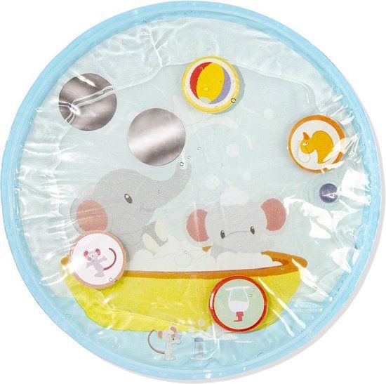 Spelen met de waterspeelmat van Studio Circus is een avontuur voor baby’s en peuters. 4 vrolijke figuren en 2 spiegeltjes bewegen rond in het water. Deze activiteitenmat stimuleert de motoriek als de kleintjes op hun buik liggen (tummy time) .