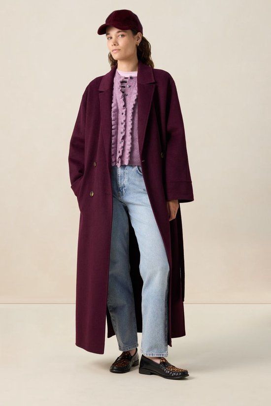 Donkerrode wollen jas van Sissy-Boy. De jas heeft lange mouwen, een reverskraag, een knoopsluiting en steekzakken. Verder heeft de jas een bordeaux rode kleur met een afneembaar ceintuur in de taille. Het model heeft een lengte van 1,74 m en draagt maat S. Materiaal: 50% wol, 45% polyester, 5% overige stoffen.