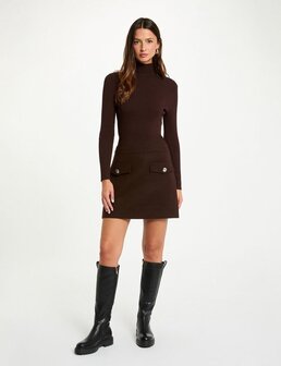 2 in 1 fitted mini dressFitted cutMini dressTurtleneckLong sleevesZip fastening on the side2 in 1 effect jumper and skirtRibbed knit on the chestFlaps yokes for a fake pocket with a button effect on the front of the waistline