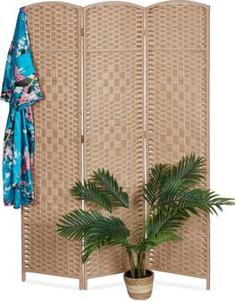 Met dit kamerscherm kun je je woning op een snuggere manier in verschillende ruimtes opdelen. Zo creëer je een gezellig hoekje in je woonkamer of een kleedruimte in je slaapkamer. Je kan de paravent echter ook gewoon als decoratie gebruiken. Omdat de scheidingswand een natuurlijke kleur en een gevlochten design heeft, is hij een echte blikvanger in iedere ruimte. Heb je de kamerverdeler even niet nodig? Dan kan je hem inklappen en opbergen zonder veel ruimte in beslag te nemen.