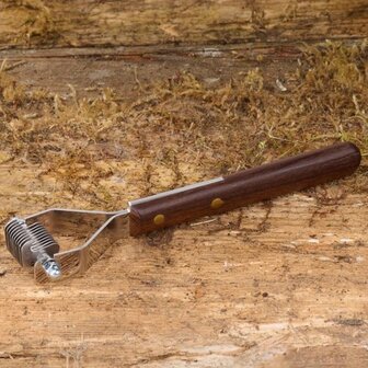 De Mars Coat-King Solingen is uitgerust met een mini breedte en fijne 1.5 mm messen, ideaal voor het verwijderen van dode ondervacht en losse haren. Het handvat, gemaakt van Bubinga hout en FSC-gecertificeerd, ligt comfortabel in de hand. De messen met afgeronde uiteinden glijden moeiteloos door de vacht en voorkomen huidirritatie, terwijl het duurzame, roestbestendige aluminium met solide roestvrijstalen messen zorgt voor een lange levensduur.