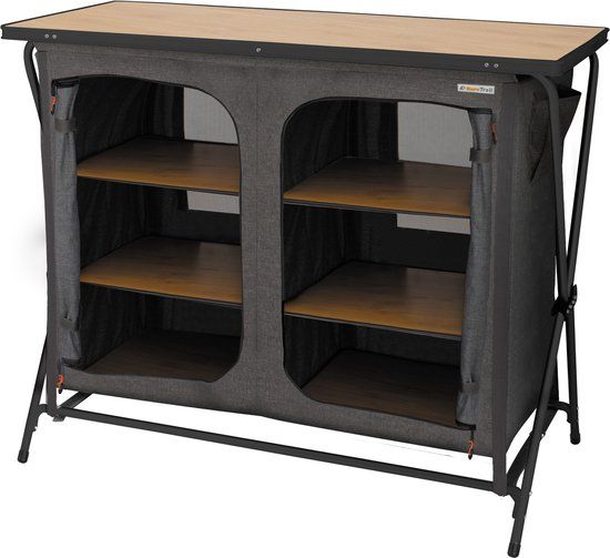Populaire dubbele campingkast, snel op te zetten en met veel opbergplek. De Forano is een breed model, de 6 ruime etages bieden ruim plaats om al uw keuken of kleding in op te bergen. De kast is vervaardigd van het gemêleerd polyester en wordt geleverd incl. topblad en stevige etage planken van bamboe materiaal. Verstelbare poten om de kast goed stabiel neer te kunnen zetten.