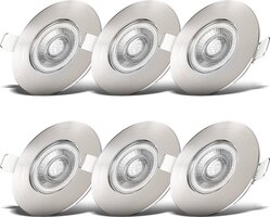 Hoogwaardige set van 6 long-life 5 Watt LED inbouwspots mat nikkel in ultraplatte uitvoering (25mm). Laag verbruik met aangenaam warm licht dankzij een kleurtemperatuur van 3.000 Kelvin. Geschikt voor badkamers dankzij IP44 spatwaterbescherming.