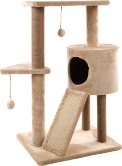 De krabpaal Paradise is een compacte krabpaal die toch veel mogelijkheden heeft voor de kat. Door de verschillende ligplaatsen kan de kat op diverse plekken alles in de gaten houden. In het huisje kan er ongestoord geslapen worden en na een goede nachtrust kan de dag gestart worden met spelen door de balletjes die aan de planken zijn bevestigd. De palen zijn bedekt met sisal zodat de nagels optimaal verzorgd kunnen worden.