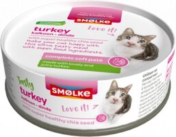 SMØLKE SOFT PATÉ KALKOEN is een ultra lekkere maaltijd met superfood ingrediënten en een heerlijk zachte bite. Daar maak je je kat gegarandeerd blij mee! De combinatie van hoogwaardige kalkoen en superfood zoals chiazaad en zalmolie maken deze soft patés een must have in het menu van iedere kat. Lekker als variatie bij de dagelijkse brokjes maar ook perfect als complete maaltijd!