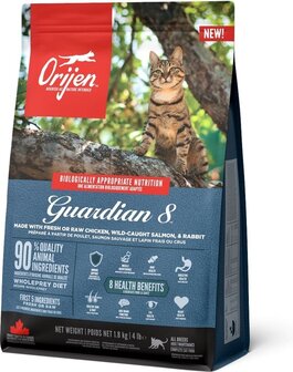 Orijen Guardian 8 is een voedzame voeding die speciaal is samengesteld om 8 veelvoorkomende kattenkwaaltjes aan te pakken door middel van hoogwaardige ingrediënten. Met 90% hoogwaardige dierlijke ingrediënten, en 2/3 daarvan vers en rauw, bevat Guardian 8 voedzame ingrediënten die de algehele gezondheid van jouw kat ondersteunen op 8 gebieden!