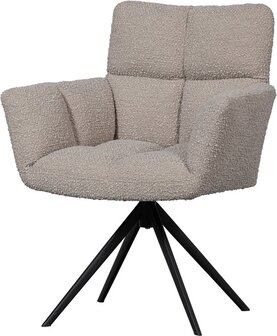Vinny is bekleed met een superzachte bouclé stof, genaamd Cres. De samenstelling van 100% polyester maakt de draaifauteuil zeer eenvoudig in onderhoud. De Vinny heeft een zwart, metalen onderstel met vier poten en een soepel draaisysteem. De polyurethaan schuimvulling geeft een hoog zitcomfort en is dus perfect voor eindeloos lang tafelen!