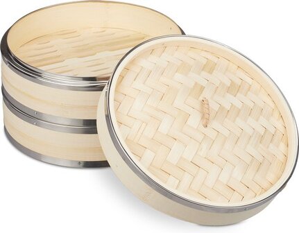 Relaxdays Bamboo Steamer - 24 cm - 2 Tier - Metal Rim - Vegetable Steamer - Steaming Basket - Keuken en eetkamer