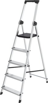 Met de BRASQ Huishoudtrap haal je een stabiele, praktische en lichtgewicht oplossing in huis voor al je klussen. Dankzij het slanke, strakke ontwerp met vijf treden kom je gemakkelijk bij elke hoge kast, stelling of plank. Met deze trap sta je veilig op 1 meter hoogte en bereik je eenvoudig je keuken-, voorraad- of magazijnkasten.