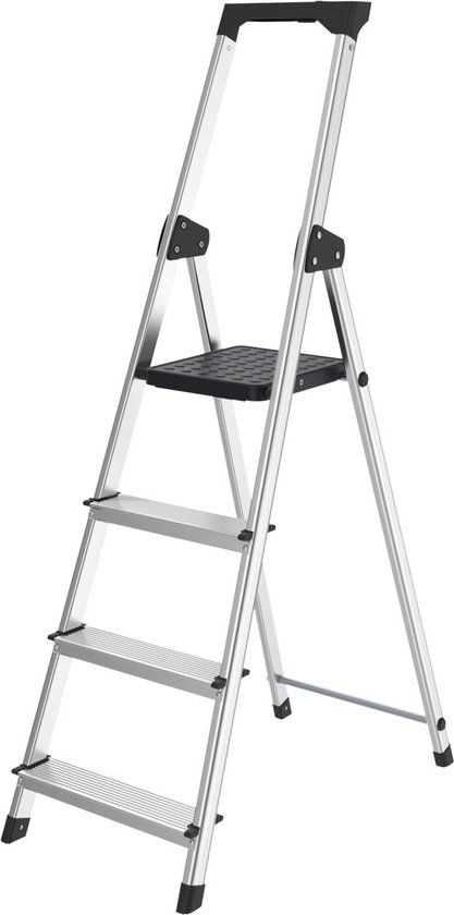 Met een stahoogte van 80 cm en een bovenplateau van 25x25 cm biedt deze trap een stabiele basis. De antislip treden en beschermkappen zorgen voor extra grip en veiligheid, zodat je zonder zorgen op hoogte kunt werken.