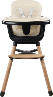 De stoelpoten en voetensteun zijn gemaakt van beukenhout, wat de kinderstoel een luxe en moderne uitstraling geeft. Zo zal hij niet misstaan in de keuken of eetkamer! Wanneer je kindje de kinderstoel niet meer nodig heeft, tover je hem gemakkelijk om tot een lage peuterstoel door de hoge poten en het veiligheidstuigje weg te halen.