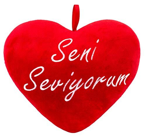 Bekijk productBRUBAKER Pluche kussen in hartvorm - Seni Seviyorum - rood 32 cm - hartkussen geborduurd - Knuffelspeelgoed