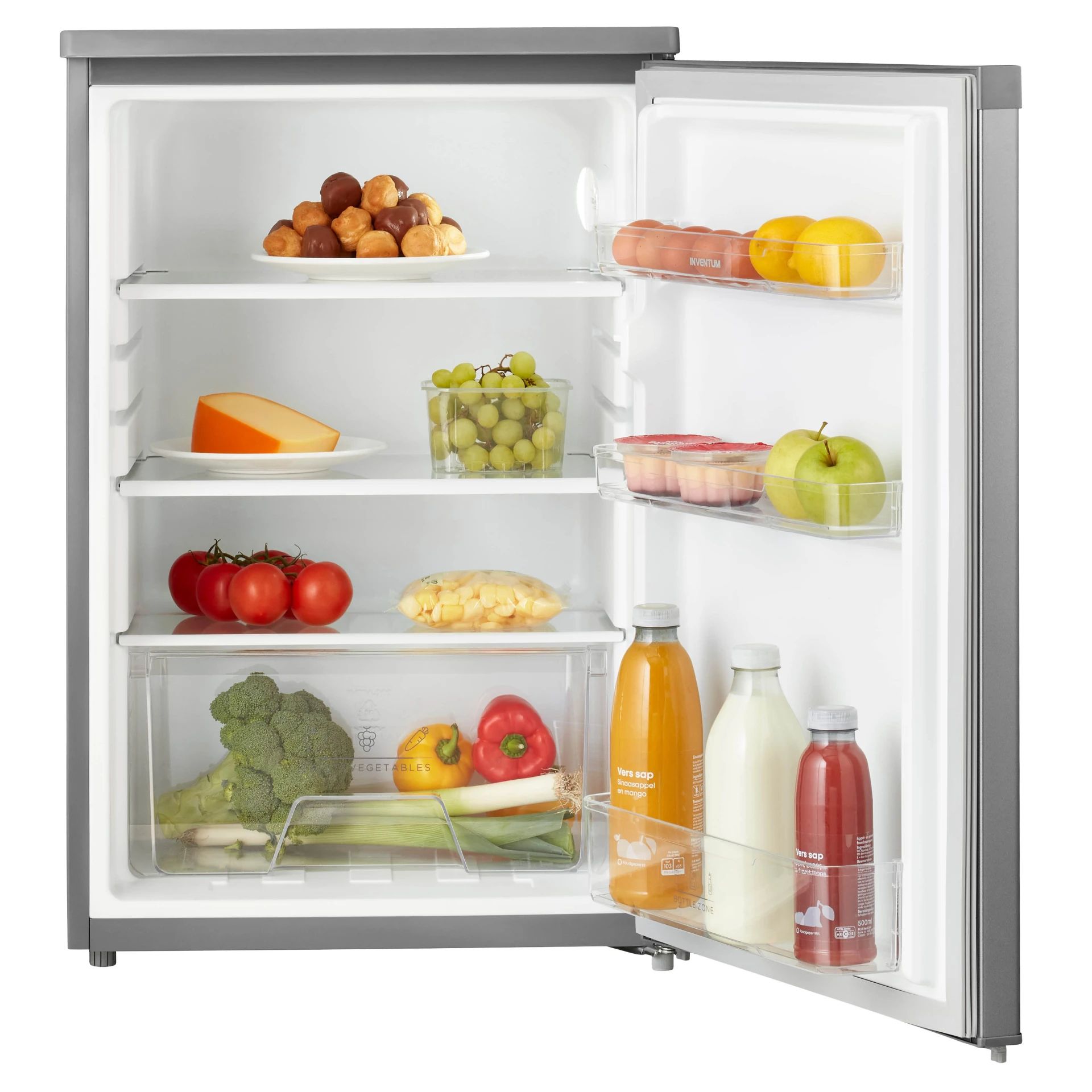 De Inventum KK550S is een compacte koelkast met 131 liter netto koelruimte. Dankzij de uitvoering zonder vriesvak benut je de volledige inhoud voor verse etenswaren en drank. Met een hoogte van 85 cm, breedte van 56 cm en diepte van 58 cm past hij gemakkelijk in kleinere keukens of als extra koelkast, terwijl je door de overzichtelijke afmetingen efficiënt met de beschikbare ruimte omgaat.