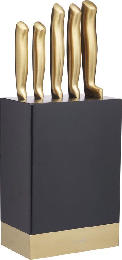 Er is iets bijzonders aan messing. Misschien is het de luxueuze uitstraling zonder overdreven te zijn. Of misschien is het gewoon die rijke glans wanneer het licht er op de juiste manier op valt. Nu heeft MasterClass dat 'bijzondere iets' weten vast te leggen en het toegepast op zijn vertrouwde assortiment keukenmessen. Het resultaat is deze weelderige messenset met een messing-achtige uitstraling: een prachtige combinatie van vorm en functie die charme en elegantie toevoegt aan elke keuken. De set bestaat uit vijf hoogwaardige roestvrijstalen messen, volledig bedekt met een prachtige coating in messing-effect. Deze passen netjes in het messenblok: een minimalistische houten doos, afgewerkt in stemmig zwart met slechts een vleugje glinsterend messing aan de onderkant. Het geheel wordt geleverd in een stijlvolle geschenkverpakking, waardoor het een ideaal cadeau is voor iedereen die van koken houdt en zijn keuken er graag goed uit wil laten zien. Of natuurlijk kunt u uzelf verwennen en uw saaie messen vervangen door een nieuwe set van hoge kwaliteit die perfect aansluit bij de laatste trends. Deze set is gedekt door de 25-jarige garantie van Masterclass.