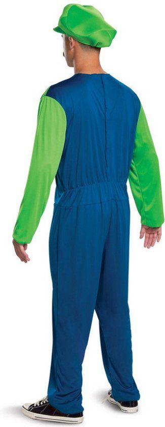 Dit Luigi-kostuum voor volwassen staat onder officiële Mario-licentie en bestaat uit een jumpsuit, hoed en snor. Het pak is in de kleuren van Luigi's uniform, groen en blauw. Het groene deel stelt Luigi's T-shirt met lange mouwen voor, terwijl het blauwe deel zijn overall voorstelt met twee nepgele knopen op de borst. Het kostuum wordt gecompleteerd door een groene pet met een groene L op een witte achtergrond en een zwarte zelfklevende nepsnor. Stap in de wereld van de videogame van Luigi voor de duur van eenthemafeestje met dit Luigi-kostuum!