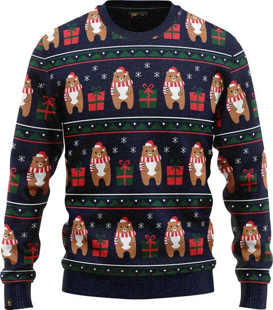 JAP Christmas Kersttrui S - Gerecycled - Beer met geschenk - Donker blauw - Kostuumjurken