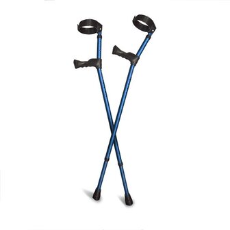 Deze elleboogkrukken blauw en zijn voorzien van voorgevormde anatomische handvatten. Daarnaast hebben deze krukken een gesloten manchet. Dankzij dit gesloten manchet omsluiten de krukken uw onderarm goed. Zo kunt u uw handen blijven gebruiken terwijl de krukken aan uw armen hangen. U kunt de elleboogkrukken dubbel verstellen. De 18 verschillende verstel mogelijkheden maken het mogelijk om de elleboogkrukken af te stellen op de voor uw juiste lengte. De bovenkant verstelt u voor de juiste lengte van uw onderarm. De onderkant van de loopkrukken verstelt u voor de juiste beenlengte. Wanneer u de elleboogkrukken niet afstelt op de juiste lengte leidt dit mogelijk tot scheef lopen. Dit kan u pijn of klachten geven aan uw schouders, rug of nek. Het is daarom belangrijk dat u het afstellen goed doet voordat u gaat lopen met de krukken. Wanneer u liever u andere kleur wilt hebben wij deze krukken blauw ook nog in het zwart, rood en grijs.
