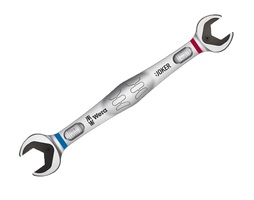 Double open-ended wrench; holding function with the metal plate in the jaw reduces the danger of losing bolts and nuts; exchangeable metal plate in the jaw with extra hard teeth secures bolts and nuts and reduces the risk of slipping; the integrated limit stop can prevent any slipping downwards from the screw head and allows a higher torque to be applied; the double-hex geometry creates a form-fitting connection with the nut or bolt and thereby lowers the risk of any slipping; a return angle of only 30° to avoid the need for any time-consuming turning of the wrench in screwdriving applications; special forged geometry for high torque transfer and great rigidity against bending; high performance chrome-molybdenum steel; nickel-chrome coating for enhanced corrosion resistance. Colour coding and forged dimension details to enable the desired JOKER to be easily located.