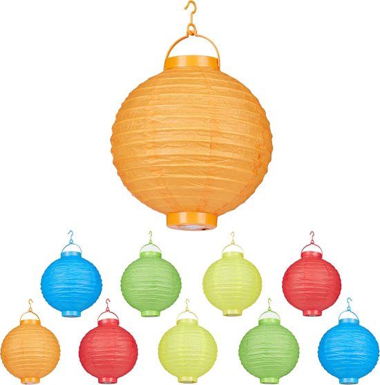 Relaxdays LED Lampions - 10 stuks - Ø 20 cm - Papier - Kleurrijk - Op Batterijen - Lantaarns