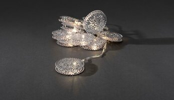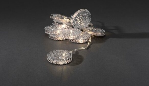 Dit lichtsnoer met decoratieve siermunten bevat 10 warm witte LED-lichtjes. De siermunten zijn zilverkleurig. De siermunten zijn opengewerkt waardoor er veel licht doorheen valt, waardoor het geheel erg sfeervol oogt. De siermunten zijn geplaatst om iedere 10 centimeter. Het lichtsnoer werkt op batterijen, deze batterijen worden er niet bijgeleverd. Het snoer is transparant, dus deze valt niet erg op. Dit lichtsnoer is bedoeld voor binnengebruik.
