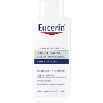 Eucerin AtopiControl, 400 ml, Huidverzorging voor Vrouwen , De doucheolie Eucerin AtopiControl geeft de huid het nodige vocht en verzorging. Na gebruik zal deze weer vol vitaliteit zijn. Kenmerken: wast voorzichtig voedt en verzacht droge huid ontspant de huid en beschermt hem tegen irritatie versoepelt en verhoogt de elasticiteit van de huid Dermatologisch getest Ingrediënten: ongeparfumeerd Hoe te gebruiken: Breng aan bij douchen of baden. Breng aan op de huid van het hele lichaam en spoel vervolgens af met warm water.