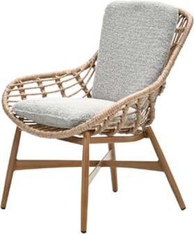 Het hoge zitcomfort gecombineerd met het weergaloze ontwerp zorgt ervoor dat u eigenlijk niet om deze stoel heen kunt. De Castello stoel is gemaakt van een stevig aluminium frame. De kuip van de stoel is afgewerkt met modern, tijdloos wicker. De kussens zijn gemaakt van boucle garen: dit geeft de kussens een zachte teddy-look en zorgt ervoor dat de kussens heerlijk zacht aanvoelen.